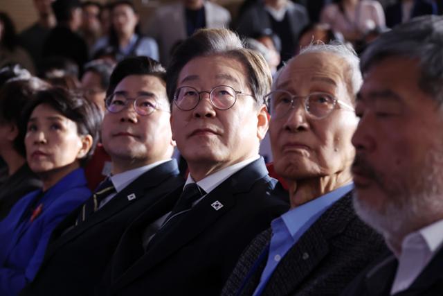 이재명(가운데) 더불어민주당 대선 후보가 30일 서울 여의도 국회 의원회관에서 열린 더불어민주당 제21대 대통령선거 '진짜 대한민국' 중앙선거대책위원회 출범식에서 영상을 보고 있다. 뉴시스 |