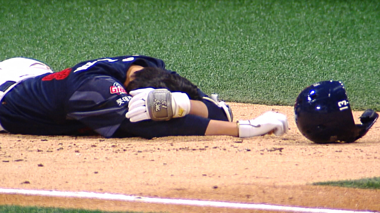투수의 시속 140km 공이 높게 날아와 헬멧을 때렸고 한참을 일어나지 못했습니다.
