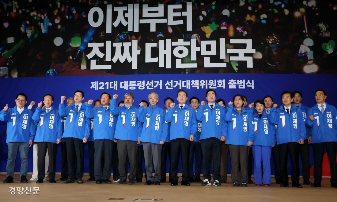 “파이팅”으로 시작 더불어민주당의 이재명 대선 후보와 윤여준·박찬대 총괄상임선거대책위원장 등이 30일 국회 의원회관에서 열린 선대위 출범식에서 파이팅을 외치고 있다. 박민규 선임기자 |