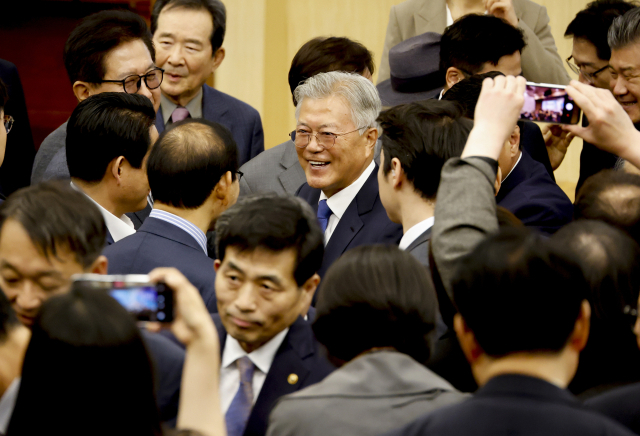 ▲문재인 전 대통령이 지난 25일 서울 여의도 국회도서관에서 열린 4.27 판문점선언 7주년 기념식을 마친 뒤 참석자들과 인사를 나누고 있다. ⓒ연합뉴스 |