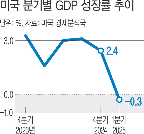 이는 지난해 4분기(2.4%)와 비교해 급감한 수치로, 역성장은 2022년 1분기(-1.0%) 이후 3년 만에 처음이다. 성장률이 1%를 밑돈 것 역시 코로나19 여파 속에 미국이 공격적인 기준금리 인상에 나섰던 2022년 2분기(0.3%)가 마지막이었다. 1분기 성장률은 다우존스가 집계한 전문가 전망치(0.4%)도 밑돌았다.
