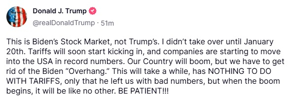 트럼프 대통령은 이날 소셜미디어(SNS) 트루스소셜에 올린 글에서 "지금 주식시장은 바이든의 주식시장이지 나의 주식 시장이 아니다"라며 "나는 1월20일에야 정식으로 시장을 인수했다"고 밝혔다.