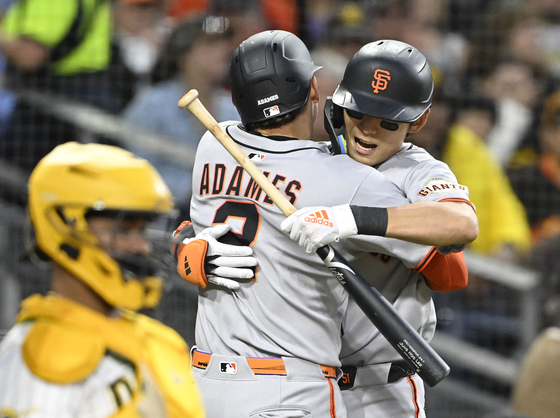30일(한국시간) 샌디에이고전에서 팀 동료 아다메스의 홈런을 축하하는 이정후. [로이터=연합뉴스 ] |