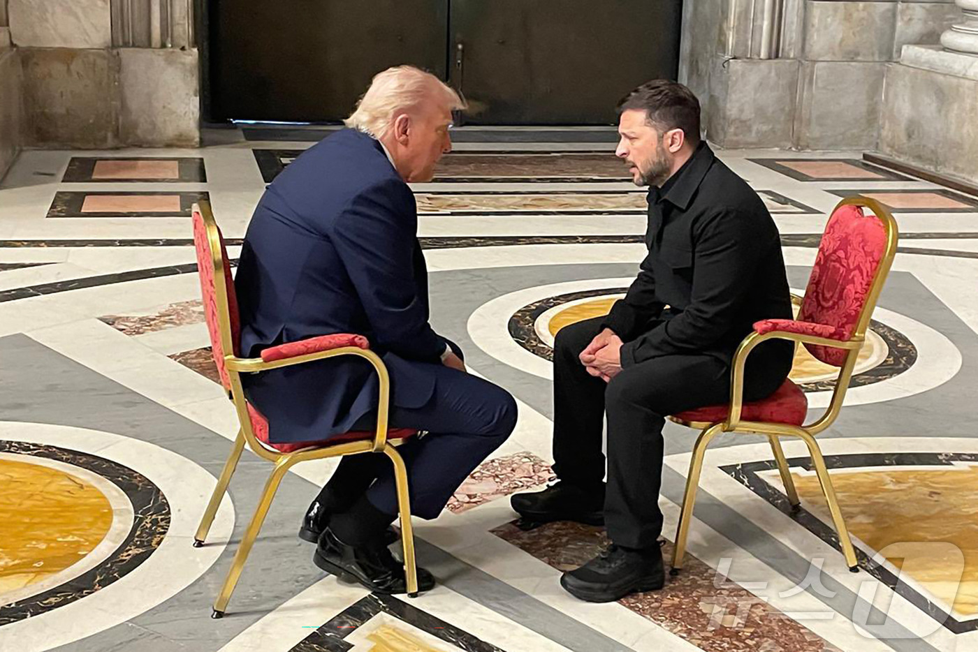 도널드 트럼프 미국 대통령과 볼로디미르 젤렌스키 우크라이나 대통령이 26일 (현지시간) 바티칸의 성 베드로 광장에서 열린 프란치스코 교황의 장례 미사에 앞서 '백악관 충돌' 두 달 만에 독대를 하고 있다. 2025.04,27 ⓒ AFP=뉴스1 ⓒ News1 우동명 기자 |