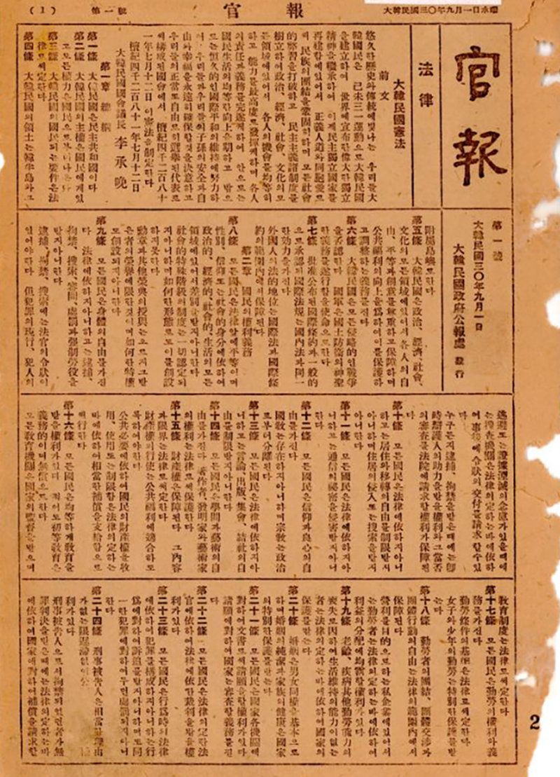 국가기록원 소장 ‘1948년 관보 제1호’의 원본도 이번에 최초로 공개됐다. 관보에는 ‘대한민국 30년’이라는 연호와 함께 헌법 전문이 실렸다. 한수 대한민국역사박물관장은 “제헌헌법 제정 당시의 원본이 사라지고 없는 오늘날, 그 기록적 근거가 되는 유물”이라고 설명했다. “대한민국은 민주공화국이라. 국권은 인민에게 있음”으로 시작하는 대한민국 임시정부의 1927년 ‘대한민국 임시약헌’(국가등록문화유산)도 만나볼 수 있다.