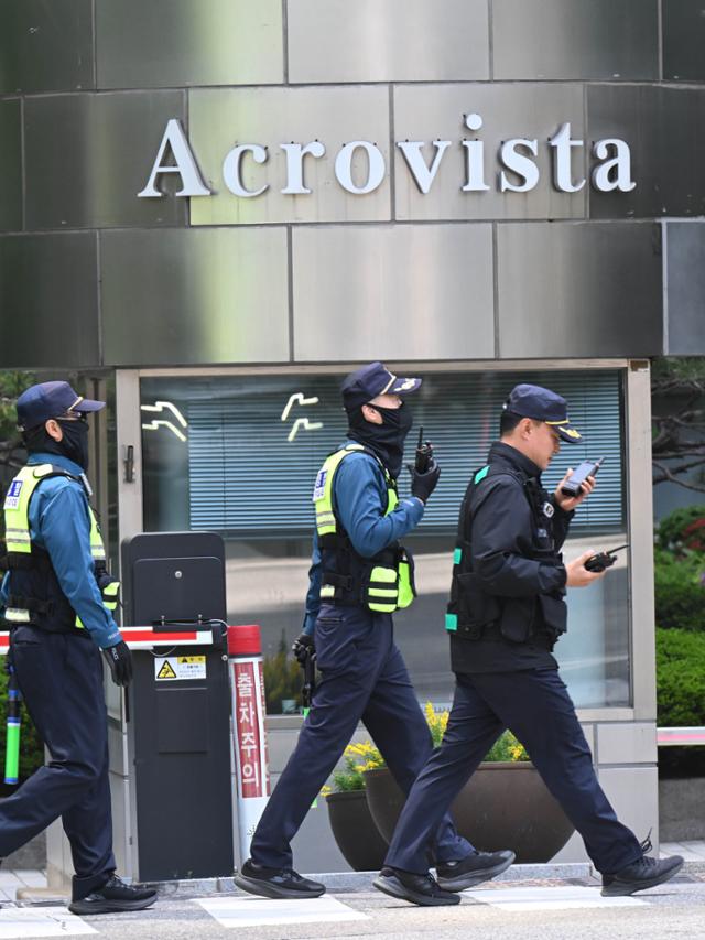 30일 무속인 '건진법사' 전성배씨의 비리 의혹과 관련해 검찰이 압수수색 영장을 집행한 윤석열 전 대통령 부부의 서울 서초동 아크로비스타 사저 인근에서 경찰이 경계 근무를 서고 있다. 왕태석 선임기자