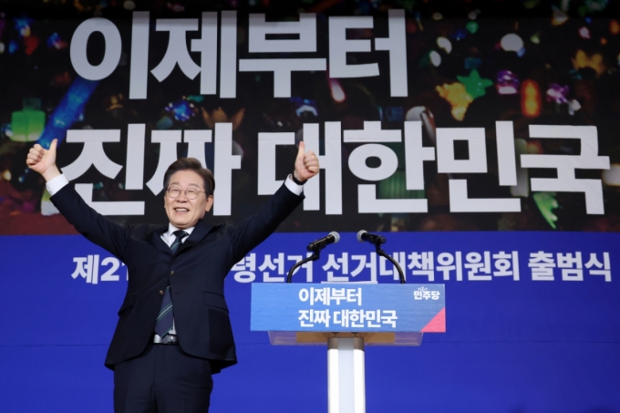 이재명 더불어민주당 대선후보가 30일 오후 서울 여의도 국회 의원회관에서 열린 더불어민주당 제21대 대통령선거 '진짜 대한민국' 중앙선거대책위원회 출범식에서 발언을 마친 뒤 두 손을 들어 인사하고 있다. /사진=뉴시스 |