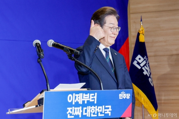 (서울=뉴스1) 안은나 기자 = 이재명 더불어민주당 대선 후보가 30일 오후 서울 여의도 국회 의원회관에서 열린 제21대 대통령선거 중앙선거대책위원회 출범식에서 연설에 앞서 엄지손가락을 치켜들고 있다. 2025.4.30/뉴스1 Copyright (C) 뉴스1. All rights reserved. 무단 전재 및 재배포, AI학습 이용 금지. /사진=(서울=뉴스1) 안은나 기자 |