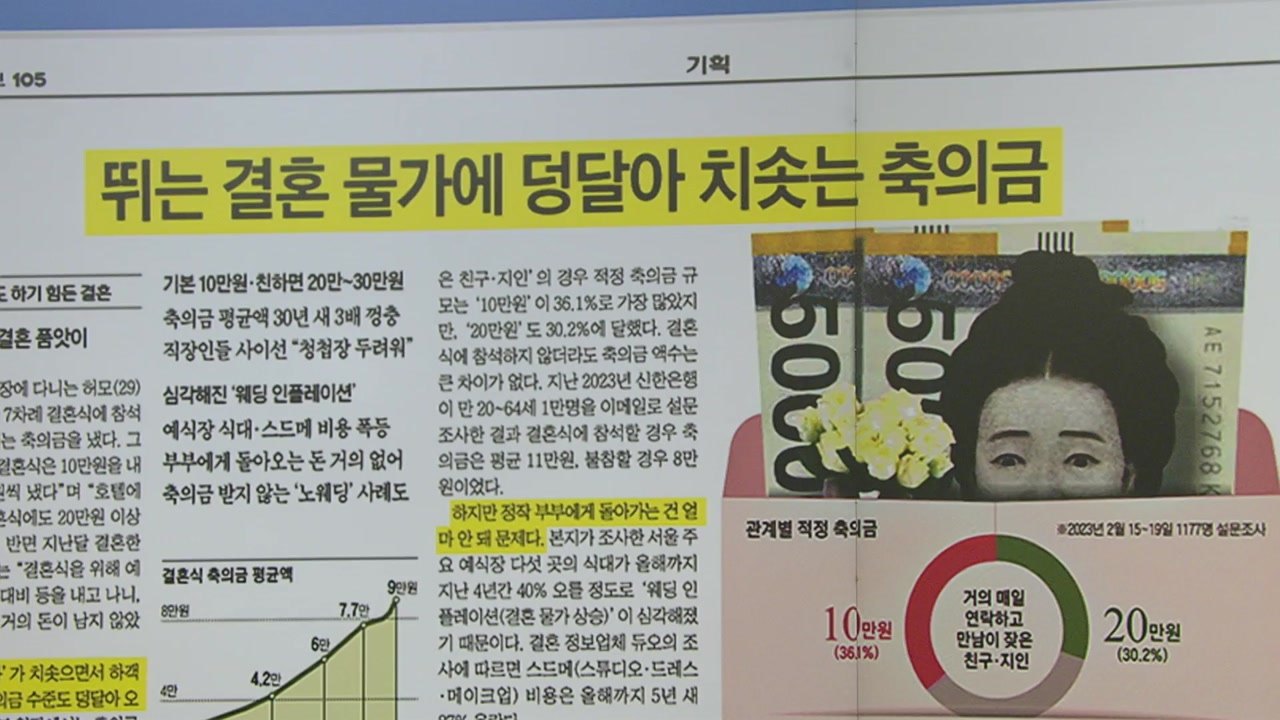 결혼하고 싶어도 하기 힘들게 하는 여러 가지 요인이 있죠. 뛰는 결혼 물가와 함께 덩달아 치솟는 축의금도 있다는 점을 다뤘습니다. '품앗이' 성격이었던 축의금 문화가 변질됐다는 지적까지 나오고 있습니다. 요즘 축의금 내려면 기본이 10만 원입니다. 친한 친구거나 동료면 20~30만 원을 내는 경우도 많고요. 결혼식이 몰린 봄철엔 한 달에 축의금으로만 100만 원 이상 나가기도 합니다. 그렇다면 축의금 평균액, 얼마나 올랐을까요? 1994년에 2만8천 원이었는데 작년엔 9만 원으로 조사됐습니다. 30년 새 3배 넘게 껑충 뛴 겁니다. 직장인들 사이에선 "청첩장 받는 게 두렵다"는 말까지 나옵니다. 하지만 정작 부부들에게 돌아가는 축의금은얼마 안 된다는 게 문제인데요. 예식장 식대에 스드메 비용 모두 폭등해서 웨딩 인플레이션이 심각하기 때문입니다. 사랑에 빠지는 게 죄는 아니라고 하는데하지만 예식을 올리는 신혼부부에게도, 또 축하해줘야 하는 하객에게도 결혼식이부담이 되고 있습니다. 이런 가운데 아예 '노웨딩'을 택하면서 축의금도 안 받는 부부까지 생기는 중입니다.