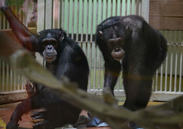 21일 경기 과천시 서울대공원 유인원관 사육장에 침팬지 광복이(오른쪽)와 관순이가 유리창 밖을 바라보고 있다. 강예진 기자 |
