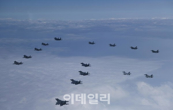 022년 한미 연합 공중무력시위 비행하는 한국 공군의 F-35A, F-15K, KF-16 전투기와 미 공군의 F-16 전투기의 모습[뉴시스 제공] |