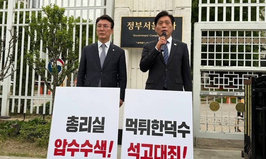 김민석 더불어민주당 수석최고위원(왼쪽)이 1일 조승래 수석대변인과 함께 서울 광화문 정부서울청사 앞에서 한덕수 대통령 권한대행 국무총리 검찰 수사를 촉구하는 기자회견을 진행하고 있다. 김민석 최고위원 페이스북 |
