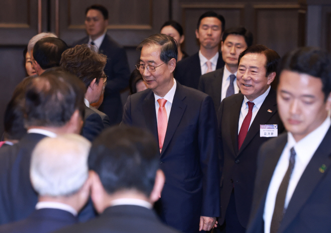 한덕수 대통령 권한대행 국무총리가 지난달 30일 서울 여의도 중소기업중앙회에서 열린 '중소기업 규제혁신 현장 소통 간담회'에서 참석자와 인사하고 있다. /연합 |
