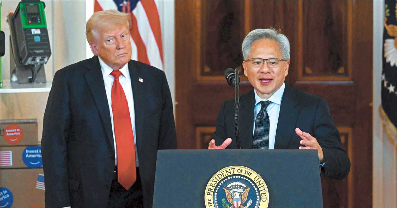 도널드 트럼프 미국 대통령이 지난달 30일(현지시간) 미 워싱턴 D.C. 백악관에서 젠슨 황 엔비디아 CEO의 연설을 옆에서 유심히 지켜보고 있다. [AFP] |