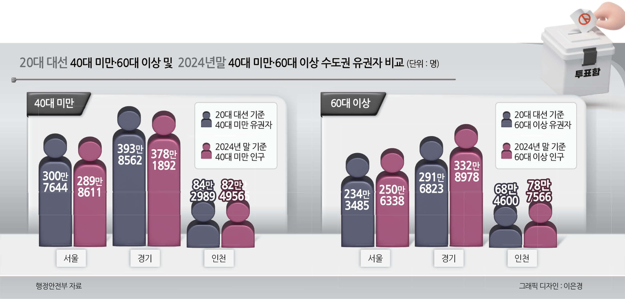 전체 유권자 중 절반을 차지하는 수도권의 경우 아직 60대 이상 인구수가 40대 미만(‘2030’ 세대)을 앞지른 것은 아니다. 하지만 서울과 경기, 인천 모두 지난해 말 인구수를 보면 2022년 20대 대선 당시 선거인 수와 비교해 60대 이상과 40대 미만의 차이가 확연히 줄어들었다. 수도권 역시 60대 이상의 비중이 늘어난 터라 달라진 선거 지형에 따른 표심 방향을 주목하지 않을 수 없게 됐다.
