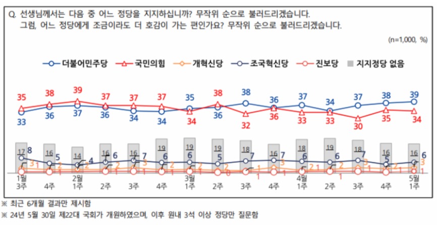 직전 조사 (4월 4주차) 비교했을 때 민주당은 1%포인트 상승했고 국민의힘은 1%포인트 하락했다. 양당의 지지도 격차는 5%포인트로 오차 범위(± 3.1포인트) 밖이다.
