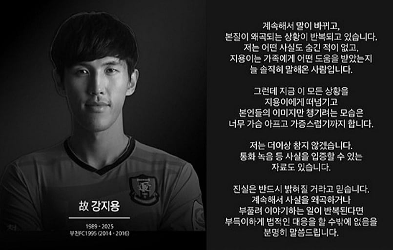 2009년 K리그 드래프트 전체 5순위로 포항 스틸러스에서 선수 생활을 시작한 강지용은 2022년 은퇴했다. 지난 2월 방송된 ‘이혼숙려캠프’에 출연해 10년 넘게 축구 선수로 생활하며 받은 연봉 등 수입을 모두 부모에게 맡겼으나 돌려받지 못하며 아내 이씨와 갈등을 빚는 모습이 공개됐다. 지난달 22일 갑작스럽게 세상을 떠났다.