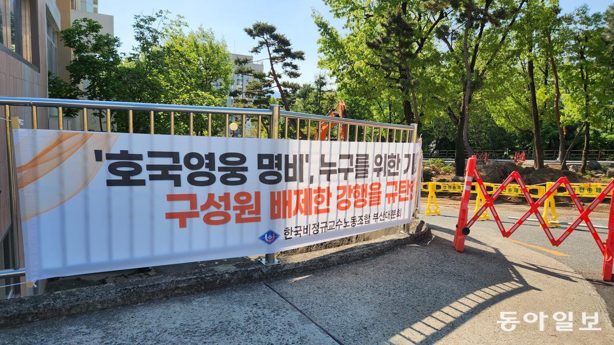 부산대 대학본부에 따르면 플래카드는 부산대교수회와 한국비정규노동조합 부산대분회 소속 교수들이 지난달 15일 전부 게시했다. 이들은 “6·26 참전 호국영웅 명비 건립이 졸속으로 추진되고 있다”며 사업 중단을 촉구하고 있다.