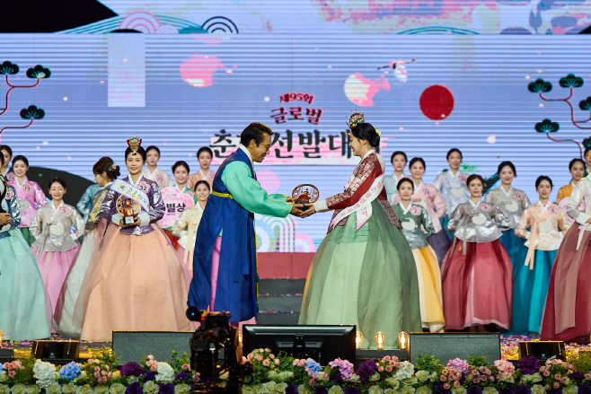 지난 30일 남원시 요천로 특설무대에서 열린 제95회 춘향제 글로벌춘향선발대회에서 춘향 진으로 선발된 김도연 양(오른쪽)이 수상하고 있다./남원시