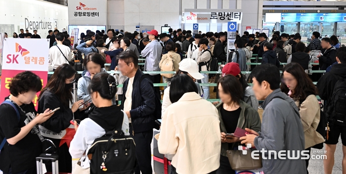 6일 간의 황금연휴가 시작된 1일 인천국제공항 1터미널 출국장에서 SK텔레콤을 이용하는 여행객들이 유심 교체를 위해 줄지어 서 있다. 인천국제공항공사는 6일까지 공항 이용객이 약 148만 명에 달할 것으로 예상되며, 오는 3일 약 21만 여명의 이용객이 몰리며 최대 혼잡이 예상된다고 밝혔다. 이동근기자 foto@etnews.com |