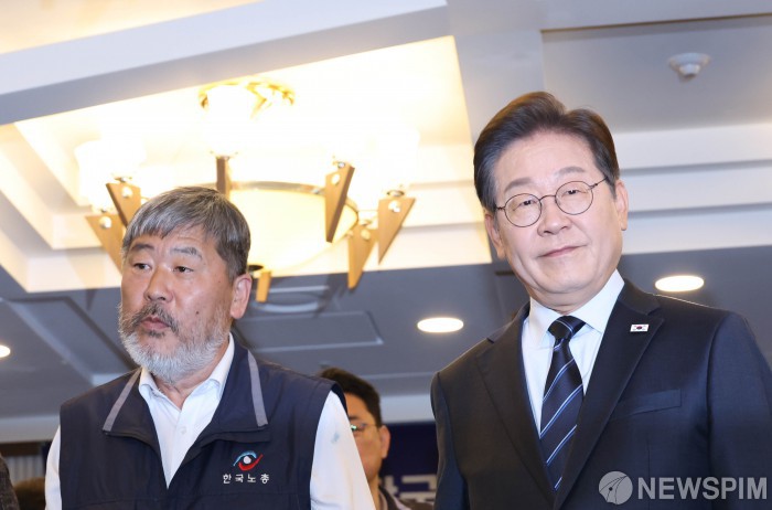 [서울=뉴스핌] 김학선 기자 = 이재명 더불어민주당 대선후보와 김동명 한국노총 위원장이 1일 서울 중구 프레스센터에서 열린 한국노총 정책협약식을 마치고 퇴장하고 있다. 2025.05.01 yooksa@newspim.com |