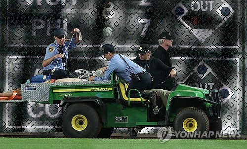 (서울=연합뉴스) 김동찬 기자 = 미국프로야구 메이저리그(MLB) 경기 도중 팬이 약 6.5m 높이에서 추락해 중태에 빠지는 사고가 벌어졌다.