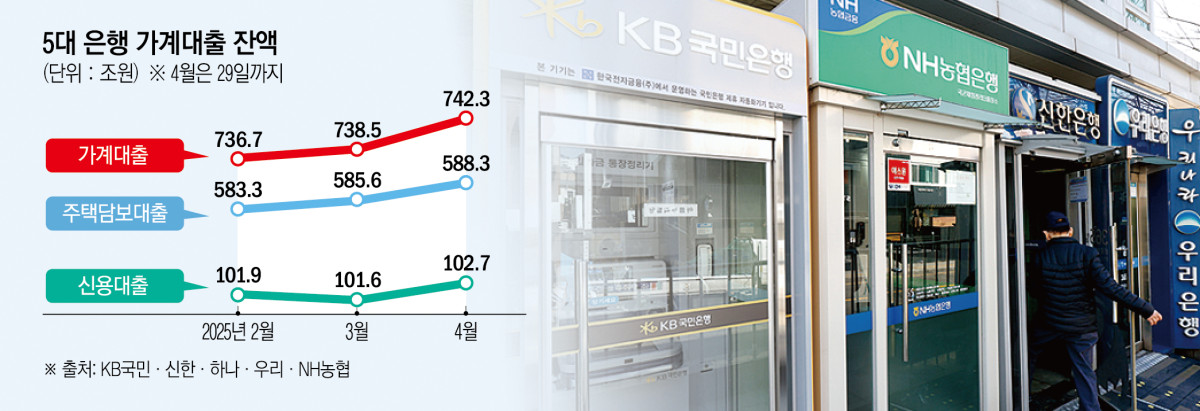 1일 금융권에 따르면 지난달 29일 기준 5대 은행(KB국민·신한·하나·우리·NH농협)의 가계대출 잔액은 742조3253억 원으로 집계됐다. 이는 3월 말 대비 3조7742억 원 증가한 규모다. 월별 증가 폭은 2단계 스트레스 총부채원리금상환비율(DSR) 적용 전 '막차 수요'가 몰렸던 지난해 9월(5조6029억 원) 이후 가장 크다.