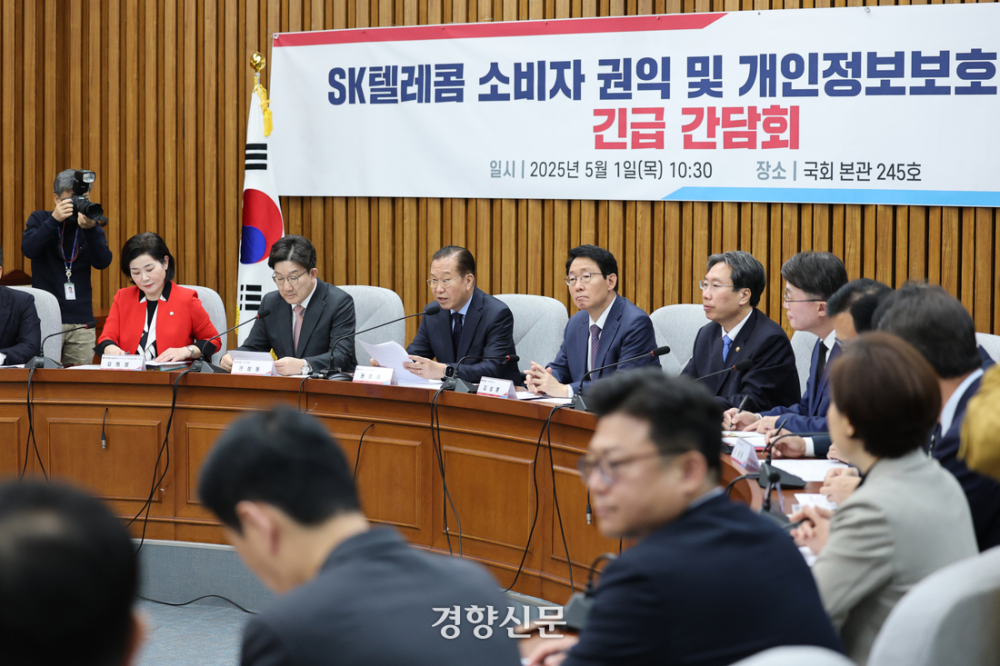 권영세 국민의힘 비대위원장(왼쪽 세 번째)이 1일 국회에서 열린 SK텔레콤 소비자 권익 및 개인정보보호를 위한 긴급 간담회에서 발언하고 있다. 박민규 선임기자 |