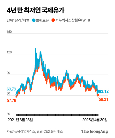 지난달 30일(현지시간) 뉴욕상업거래소에서 서부텍사스산원유(WTI)는 배럴당 2.21달러(3.7%) 떨어진 58.88달러에 거래를 마쳤다. WTI 가격은 배럴당 60달러 선을 내주면서 2021년 3월 23일(57.76달러) 이후 4년 1개월여 만에 가장 낮은 수준으로 주저앉았다. 이날 브렌트유는 전 거래일보다 배럴당 1.13달러(1.8%), 두바이유는 2.08달러(3.2%) 하락하면서 각각 63.12달러, 62.53달러를 기록했다.