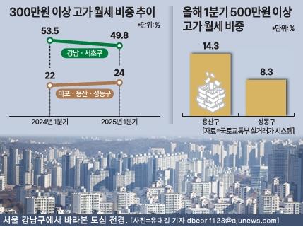 최근 1년 새 마포·용산·성동구를 중심으로 비강남권 고가 월세도 비중을 높이고 있다. 지난해 1분기에 300만원 이상 월세 거래에서 마용성이 차지하는 비중은 22%였으나 올해 1분기에는 마포구 93건, 용산구 111건, 성동구 129건 등으로 전체 중 24%에 달했다.