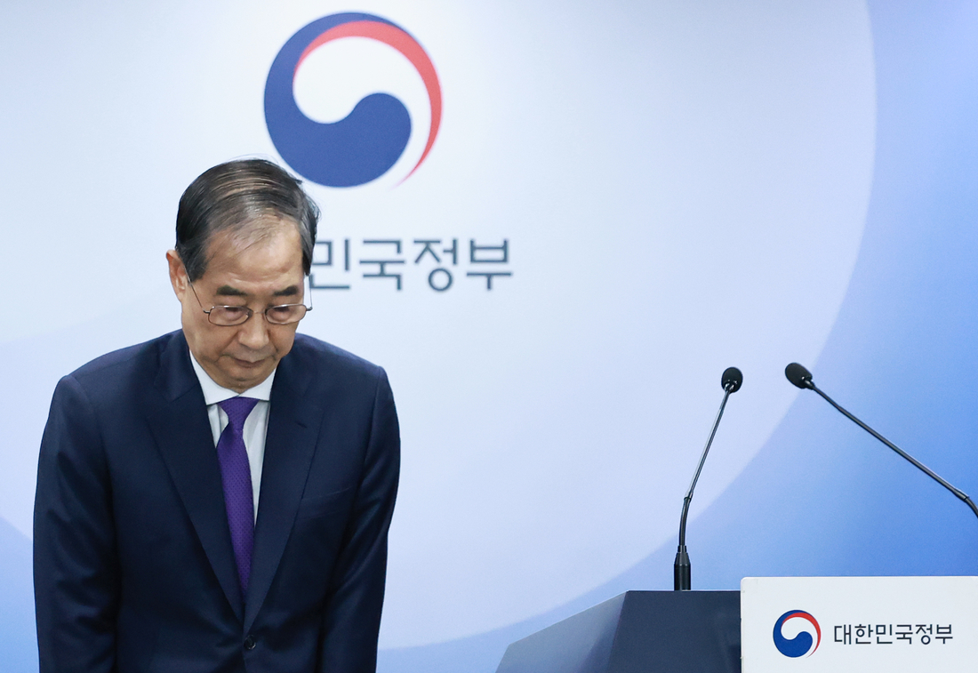 한덕수 대통령 권한대행이 1일 정부서울청사에서 대국민담화를 하던 중 허리 숙여 인사하고 있다. 연합뉴스 |