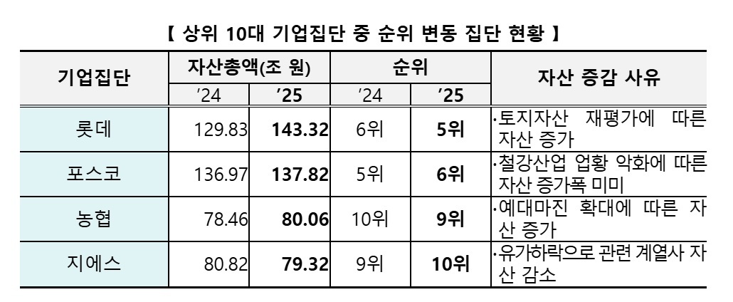 가상자산 거래소인 업비트 운영사 두나무가 상위 대기업으로 재지정되고, 업계 2위 거래소 빗썸도 대기업 명단에 처음으로 포함됐다. 10대 그룹에서는 롯데가 포스코를, 농협이 GS를 각각 제치고 한 순위씩 올라갔다.