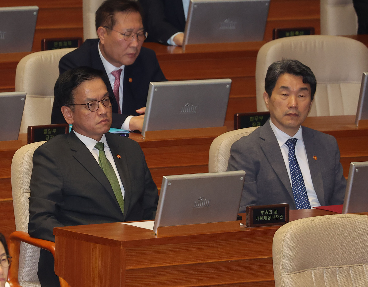 최상목 경제부총리 겸 기획재정부 장관과 이주호 사회부총리 겸 교육부 장관이 1일 국회에서 열린 본회의에 참석해 있다. 연합뉴스 |