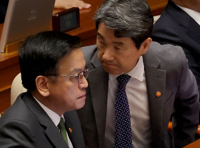 ▲최상목 경제부총리 겸 기획재정부 장관(왼쪽)과 이주호 사회부총리 겸 교육부 장관이 1일 저녁 국회에서 열린 본회의에 참석해 있다. ⓒ연합뉴스 |
