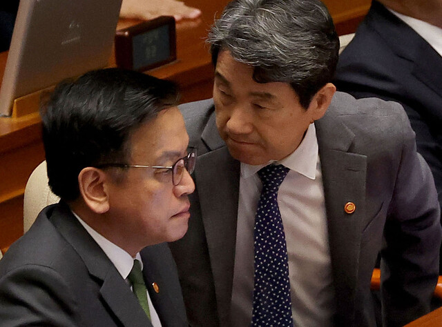 최상목 부총리 겸 기획재정부 장관(왼쪽)과 이주호 부총리 겸 교육부 장관이 1일 국회에서 열린 본회의에 참석해 있다. 연합뉴스 |