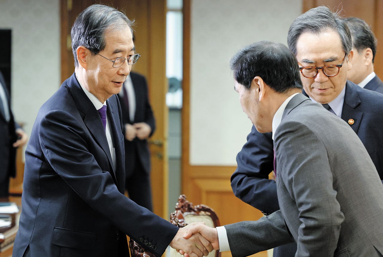 한덕수 대통령 권한대행 국무총리가 1일 정부서울청사에서 열린 안보 관계 장관 회의에서 김선호 국방부 장관 직무대행과 악수하고 있다. 김 직무대행 오른쪽은 조태열 외교부 장관. /연합뉴스 |