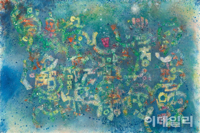 남관의 ‘가을축제’(1984). 애잔함을 가둬낸 예전의 ‘푸름’은 여전하지만 밝고 생동감 있는 화면에는 동화적인 세계가 떠 있다. 1980년대 작가 말기의 이 분위기에는 ‘데콜라주 기법’이 쓰였다. 콜라주를 역이용해 캔버스에 붙인 재료를 떼어낸 뒤 그 자리에 색을 칠하는 방식이다. 화업 내내 품어온 추상화한 문자도 보이고 기호화한 인간상도 보인다. 작가는 “유럽문명 속에서 오래 살다 보니 갈수록 그리워지는 것은 동양적인 사색과 낡은 공간에 대한 애정”이라고 회고하기도 했다. 5월 1일 국립현대미술관 서울에서 개막한 ‘MMCA 서울 상설전: 한국현대미술 하이라이트’에 걸렸다. 캔버스에 유화 물감, 200×300.5㎝. 국립현대미술관(이건희컬렉션) 소장. |