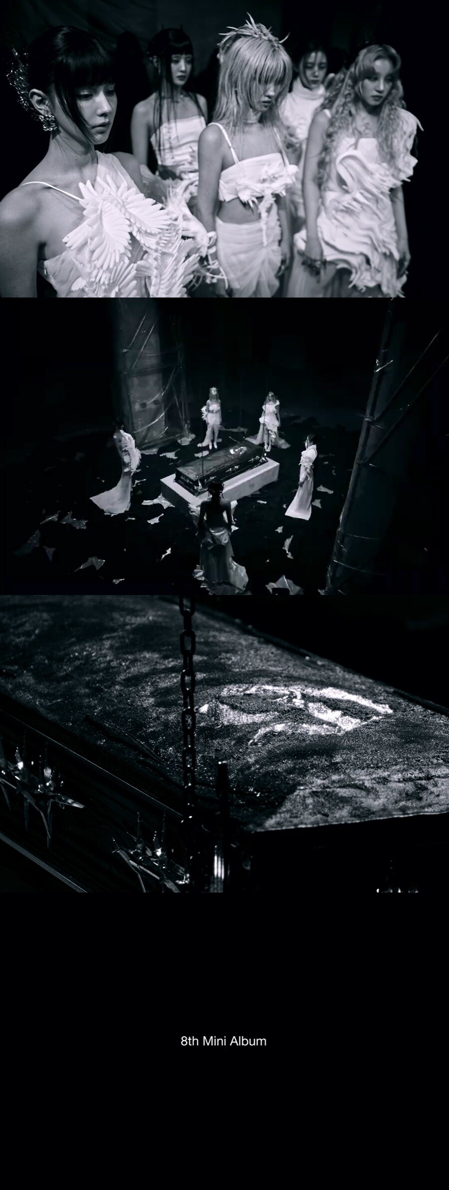 아이들은 영상에서 검은 로브를 입은 사람들과 함께 와인 비를 맞으면서도 춤을 추고 웃음 지으며 그동안 함께한 '지(G)'를 애도했다. 이후 모두가 떠난 자리에는 타버린 '지'의 관만 남은 가운데 아이들의 데뷔곡인 '라타타' 가사 중 "누가 뭐 겁나?"를 부르는 목소리가 이어졌다.