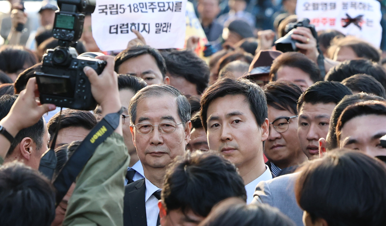 ▲ 2일 오후 광주 북구 국립5ㆍ18민주묘지를 찾은 한덕수 전 총리가 광주비상행동 등 시민사회단체 관계자들에게 가로막혀 있다.