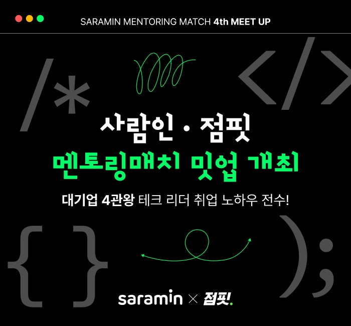 사람인과 개발자 채용 플랫폼 점핏은 오는 14일 오후 7시 IT개발 직무를 주제로 취업준비생 대상 온라인 멘토링 행사 '멘토링매치 밋업'을 개최한다고 3일 밝혔다.
