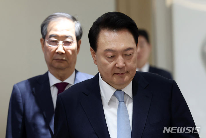 [서울=뉴시스] 전신 기자 = 윤석열 대통령이 16일 서울 용산 대통령실 청사에서 열린 국무회의에 한덕수 국무총리와 함께 입장하고 있다. (대통령실통신사진기자단) 2024.04.16. photo1006@newsis.com |