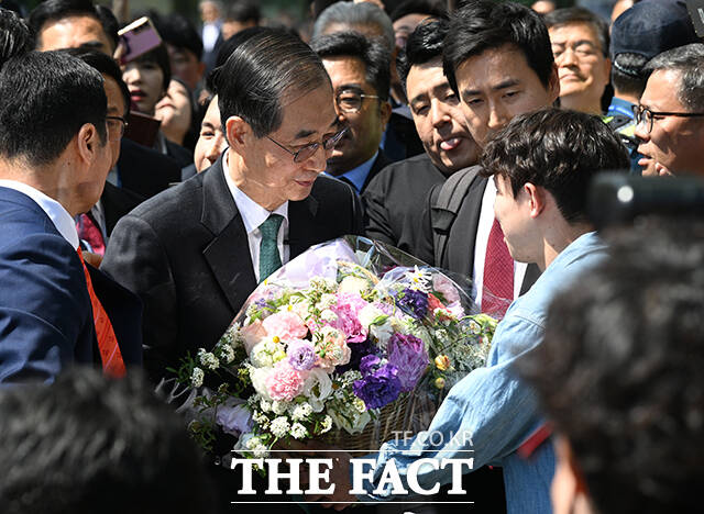 한덕수 전 총리가 대선 출마 선언 후 5·18 민주묘지를 찾은 것과 관련해 더불어민주당이 "5월 영령을 능멸했다"고 비판했다. 사진은 2일 대통령 선거 출마 선언을 마치고 지지자로부터 꽃바구니를 건네받는 모습. /국회=박헌우 기자 |