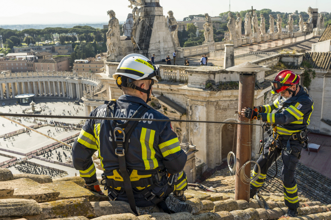 ‘흰 연기’ 언제쯤 볼 수 있을까 소방관들이 지난 2일(현지시간) 다음 교황을 뽑기 위한 콘클라베가 열리는 바티칸 시스티나 성당 꼭대기에 굴뚝을 설치하고 있다. EPA연합뉴스 |