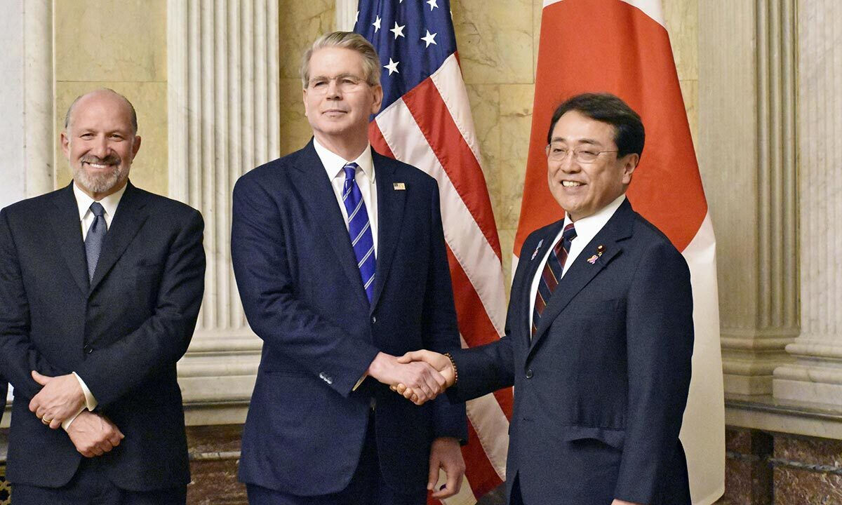 스콧 베선트 미국 재무부 장관(가운데)과 아카자와 료세이 일본 경제재생상(오른쪽)이 1일(현지시간) 미국 워싱턴DC에서 2차 관세 협상을 위해 만나 악수하고 있다. 왼쪽은 하워드 러트닉 미국 상무부 장관. 연합뉴스 |