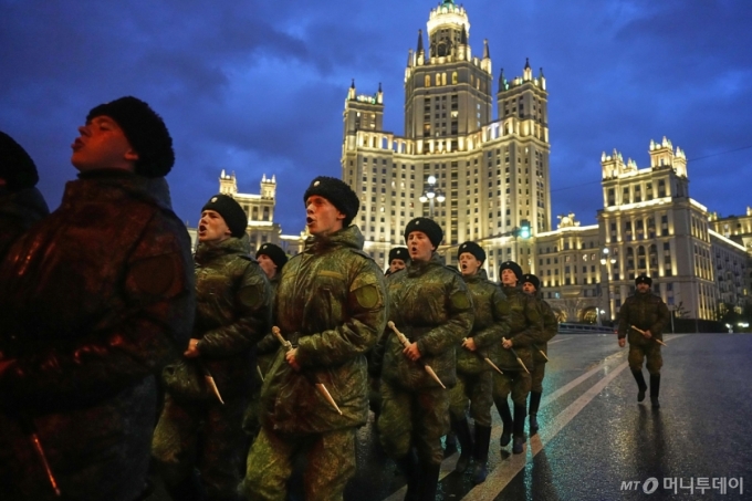 29일(현지 시간) 러시아 모스크바에서 코사크족 전사들이 전승절 군사 퍼레이드 예행연습을 하며 붉은광장으로 행진하고 있다. 러시아는 5월 8일 제2차 세계대전 승전 80주년(전승절)을 맞는다. /사진=AP/뉴시스 |
