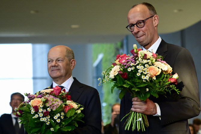 6일, 베를린 총리관저에서 열린 이임식에서 새로 선출된 독일 총리 프리드리히 메르츠(오른쪽)와 전임 총리 올라프 숄츠가 총리관저 직원들로부터 받은 꽃다발을 들고 포즈를 취하고 있다.(사진=AFP) |