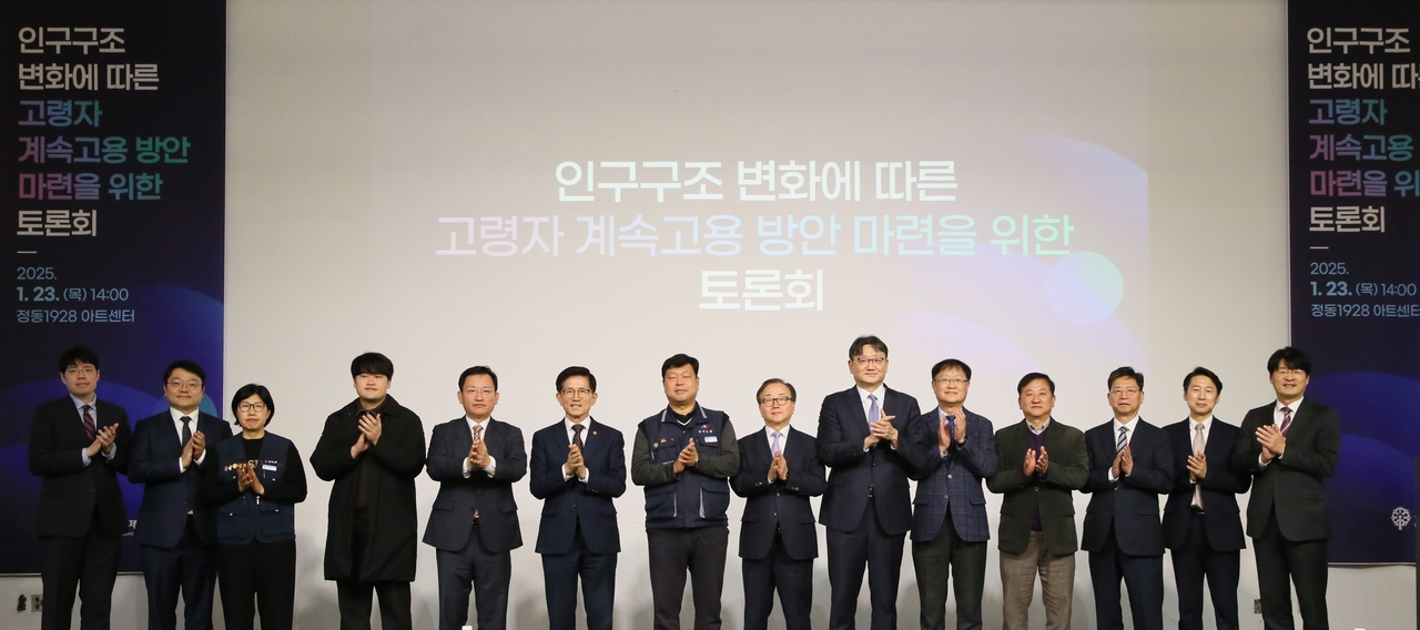 권기섭 경제사회노동위원회 위원장이 23일 서울 중구 정동1928 아트센터에서 열린 ‘인구구조 변화에 따른 고령자 계속고용 방안 마련을 위한 토론회’에서 참석자들과 기념 촬영하고 있다. [연합] |
