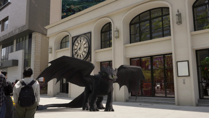 공개된 영상은 ‘버크 섬’에서 서울까지 날아온 드래곤 ‘투슬리스’가 하늘 위에서 내려다본 서울 광화문 광장의 풍경을 1인칭 시점으로 그려내 눈길을 사로잡는다. 난생처음 서울에 놀러 온 ‘투슬리스’가 주변을 살피다 드래곤 그림자가 드리운 한 건물을 발견하고 그 주변을 휘감으며 곡예비행을 선보이는 스펙터클한 장면을 연출해 시선을 집중시킨다. 곧이어 ‘투슬리스’의 거대한 날갯짓이 바람을 일으키면서 영화 ‘드래곤 길들이기’의 새로운 이미지가 드러나 작품에 대한 관심과 흥미를 고조시킨다. 마지막으로 광화문 광장 위에 무사히 착륙한 ‘투슬리스’가 한국의 예비 관객들과 직접 마주하는 모습까지 생생하게 그려지며 영상에 특별한 매력을 더한다.