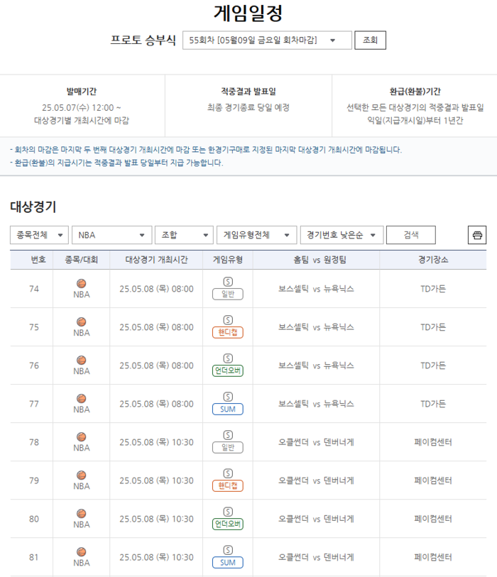 NBA 플레이오프 2라운드 두 경기를 대상으로 한 프로토 승부식 55회차의 상세 분석 및 구매 정보는 공식 인터넷 발매사이트 내 토토가이드 페이지에서 확인할 수 있다. duswns0628@sportsseoul.com