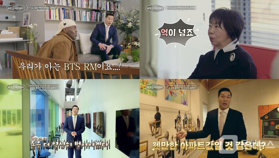 이어서 '세계적인 팝아트의 거장' 데이비드 호크니의 약 15m 크기 대형 그림 앞에서 "이분 그림인데 이 사이즈라면 웬만한 아파트값은 될 것"이라며 놀라움을 감추지 못한다. "나중에 우리집 벽에 걸면 진짜 행복하겠다"라며 한참을 감상에 빠진 서장훈의 모습은 '이웃집 백만장자' 방송을 통해 확인할 수 있다.